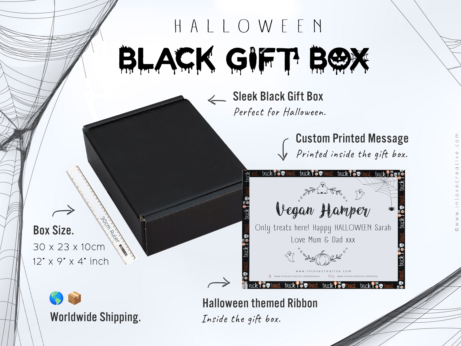 • Snacks Hamper - Chocolate Bars & Snacks 🍫🍬 a larger mix of delicious vegan chocolate bars and custom printed message. Handcrafted in a sleek black gift box, perfect for that spooky Halloween vibe. Inside, your personalised message is beautifully printed and surrounded by Halloween “Trick or Treat” ribbon , adding a playful, seasonal touch, making the moment of unboxing extra magical.